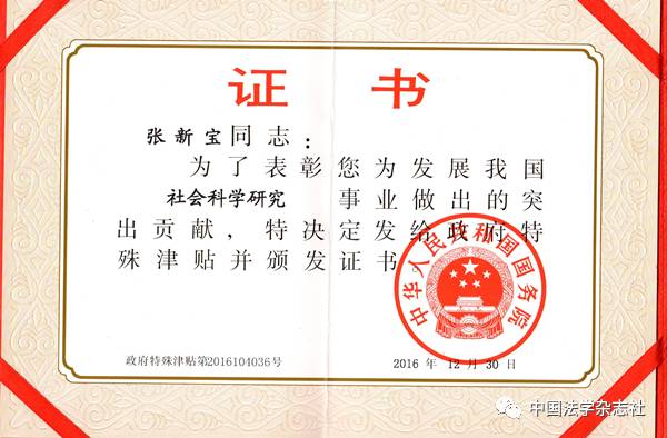 近日,人力资源和社会保障部公布了2016年享受国务院政府特殊津贴人员名单,我社总编辑张新宝教授入选。